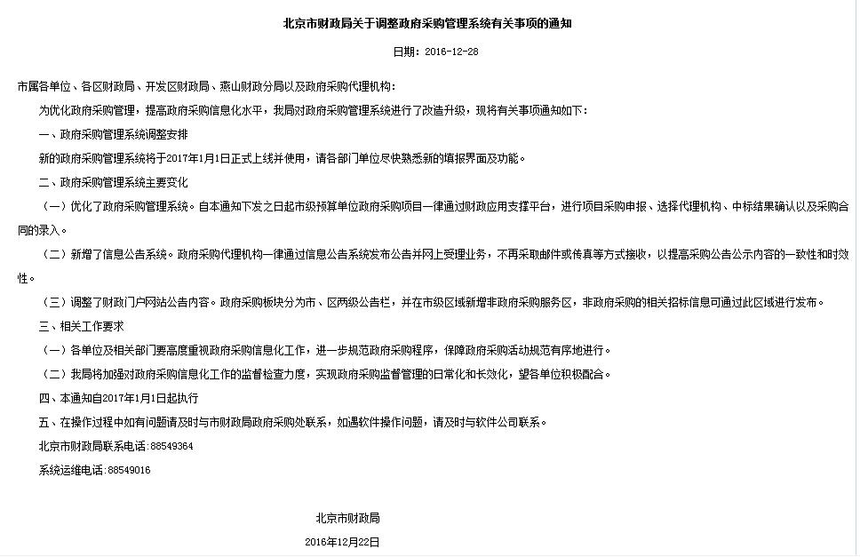 北京市财政局关于调整政府采购管理系统有关事项的通知