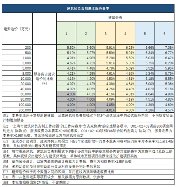 根据建筑功能复杂程度把项目分为 6 个等级,根据级别对收费设定相应的造价比例。
