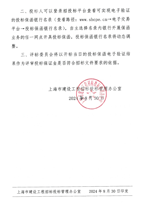 为进一步优化本市建设工程招投标领域营商环境,打击围标、串标等违法行为,规范建设工程招投标市场,2024年8月30日,上海市建设工程招标投标管理办公室印发了《关于本市建设工程招投标领域推广可电子验证的投标保函的通知》(沪建招 〔2024〕9号),就推行可电子验证的投标保函的时间、投标保函银行名录、投标保证金评标委员会评审依据等事宜做出相关要求(详见文末附件)。