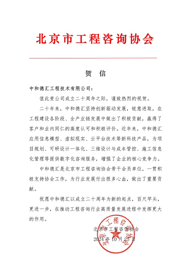 喜讯┃北京市工程咨询协会祝贺中和德汇20周年贺信