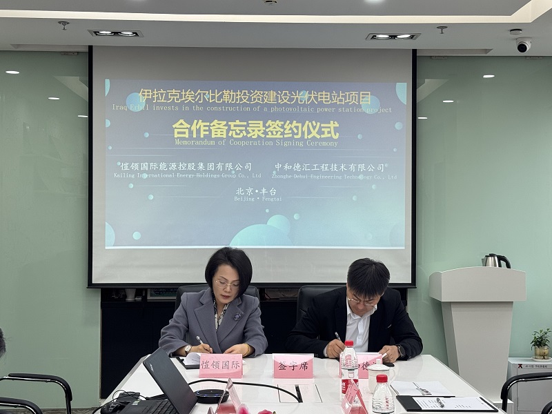 3月11日下午,愷领国际能源控股集团有限公司(以下简称“愷领国际”)与中和德汇工程技术有限公司(以下简称“中和德汇”)在北京丰台正式完成了关于伊拉克埃尔比勒光伏电站项目的签约仪式。